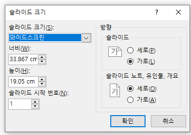 슬라이드 크기에서 와이드스크린(16:9), 가로형, 슬라이드 노트, 유인물, 개요는 세로로 설정하면 된다.