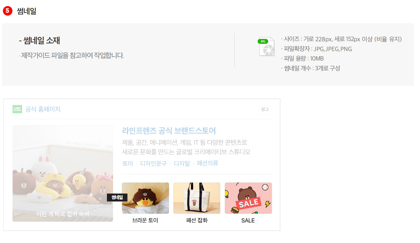 6) 썸네일 소재 사이즈는 228px, 세로 152px 이상 비율을 유지해서 제작하면 됩니다. 유의할 점은 썸네일은 단일 이미지로 사용 가능하며 테두리 라인 사용은 불가합니다.
