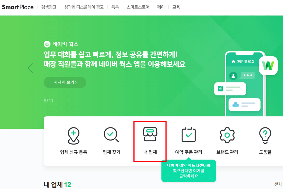 네이버스마트플레이스에 접속하면 해당 화면이 뜹니다. 내업체를 클릭하여 이동해주세요.