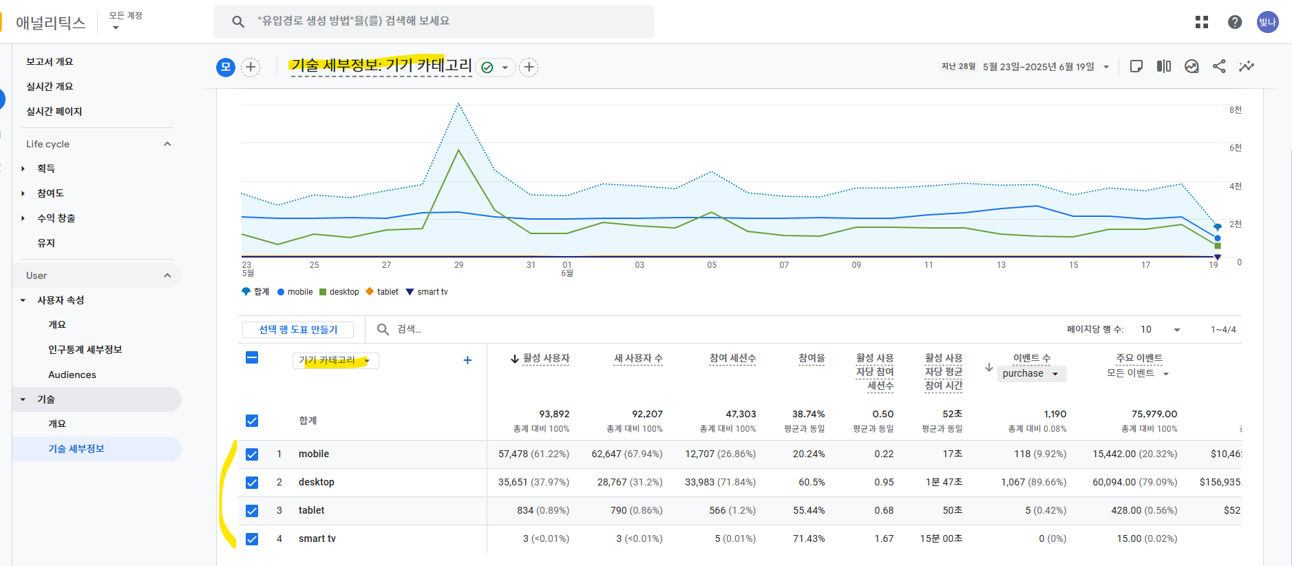 기술 - 기술 세부정보 - 기기카테고리 - 이벤트수(purchase)
