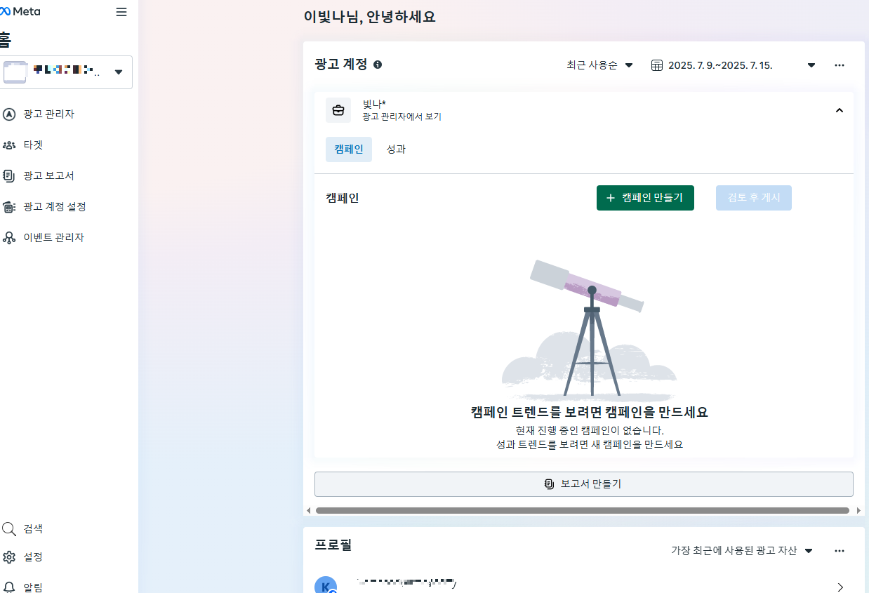 위의 이미지가 광고관리자 계정입니다. 직관적으로 나와 있어서 순서대로 세팅하시면 됩니다.